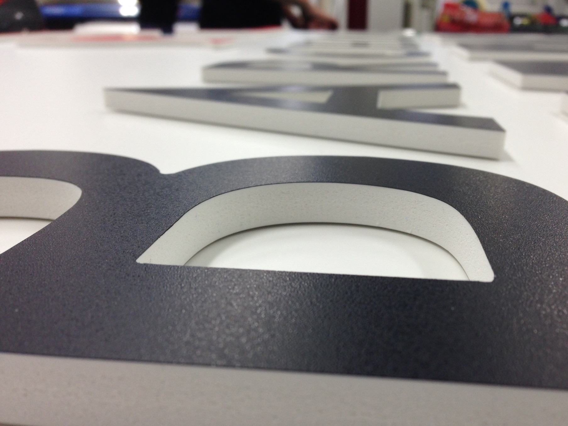 Jetzt Profilbuchstaben anfragenHier wurde ein 30mm starkes Kömacel® mit der CNC Fräse gefräst und dann mit einer schwarzen Tafelfolie bezogen. Da Kömacel® am Rand immer offenporig ist und sich dort Schmutz reinsetzten kann, bieten wir ihnen gern an, das wir den Rand spachteln und lackieren.