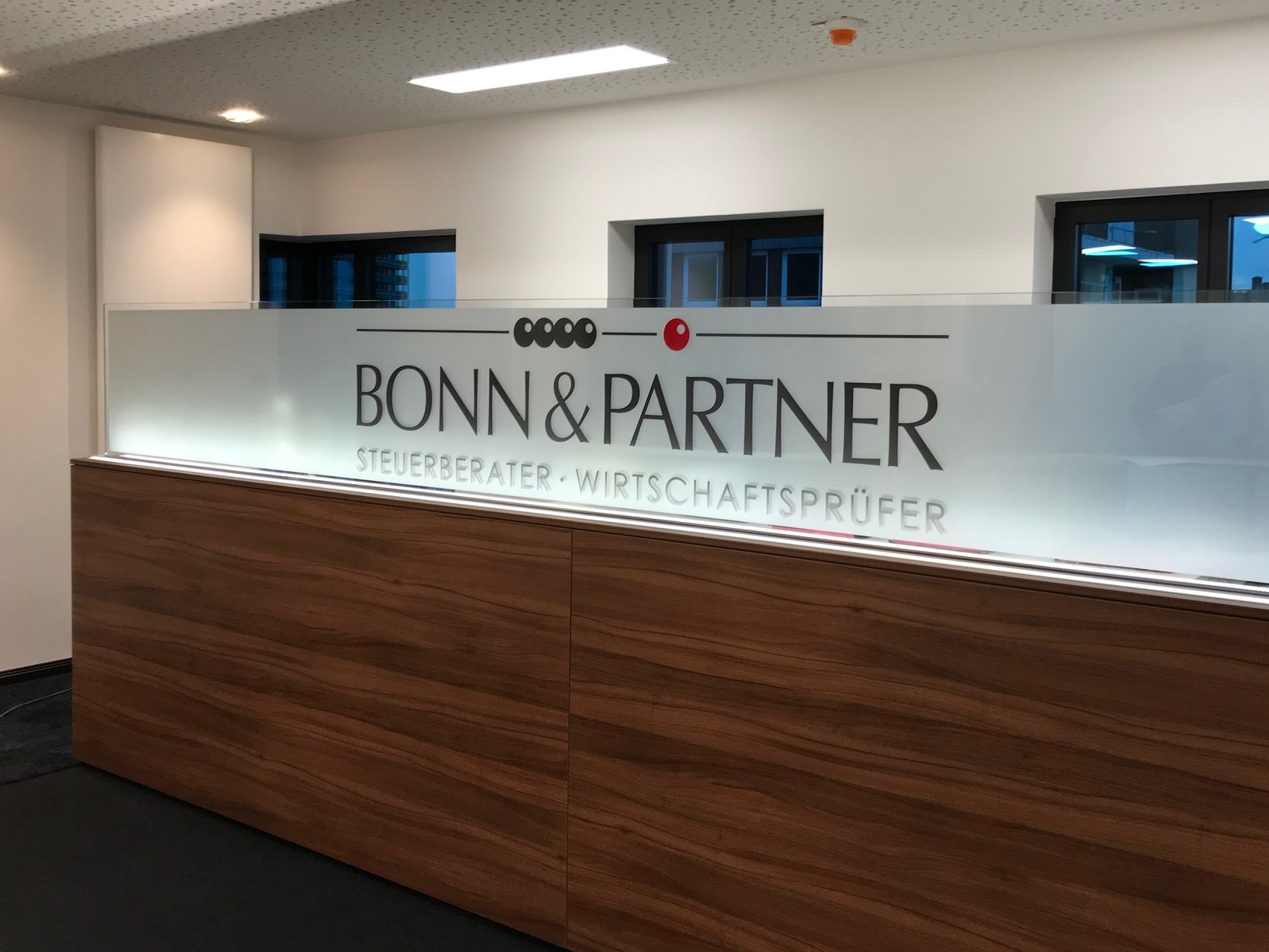 Das ist eine Glasbeschriftung von vorn mit Folienbuchstaben und die Milchglasfolie von hinten verklebt, das alles wird vorher mit dem Kunden abgestimmt, damit es zu einem guten Ergebnis kommt. Die Länge der Milchglasfolie beträgt ca. 5m umlaufend mit einer 50 mm Schattenfuge. Die Beschriftung ist ein Digitaldruck, der danach konturgeschnitten wurde.